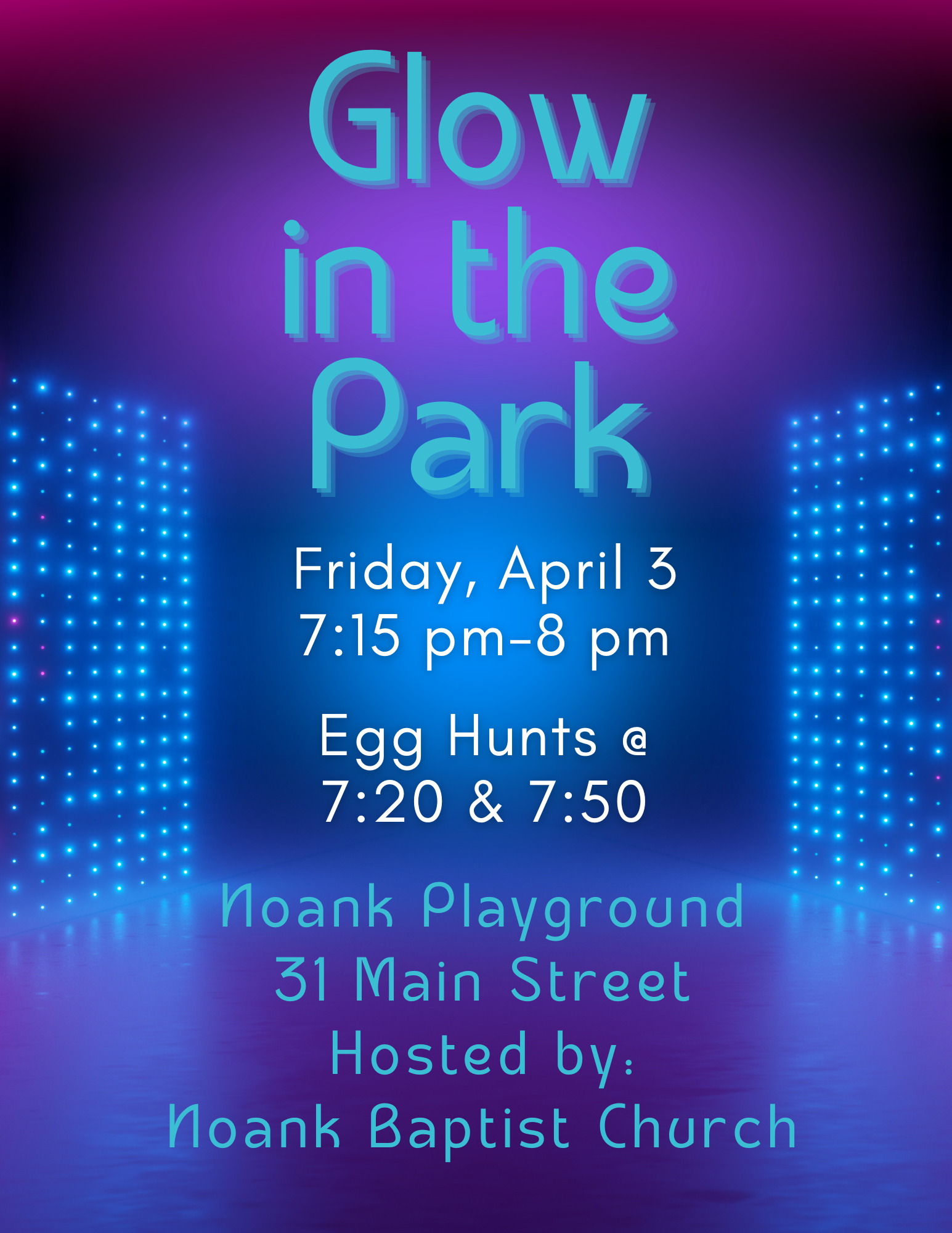 Join us for our Glow in the Park Easter Celebration. Games for all ages will begin at 7:15- 7:45pm. The Egg hunt for ages 2-K5 will be held at 7:20. Egg Hunt for 1st- 5th grade will be held just after dark at approximately 7:50pm. For their safety, toddlers are encouraged to hunt for eggs at any point at the toddler egg hunt booth. Plan now to join us for games, prizes, inflatables, snacks and lots of candy!!